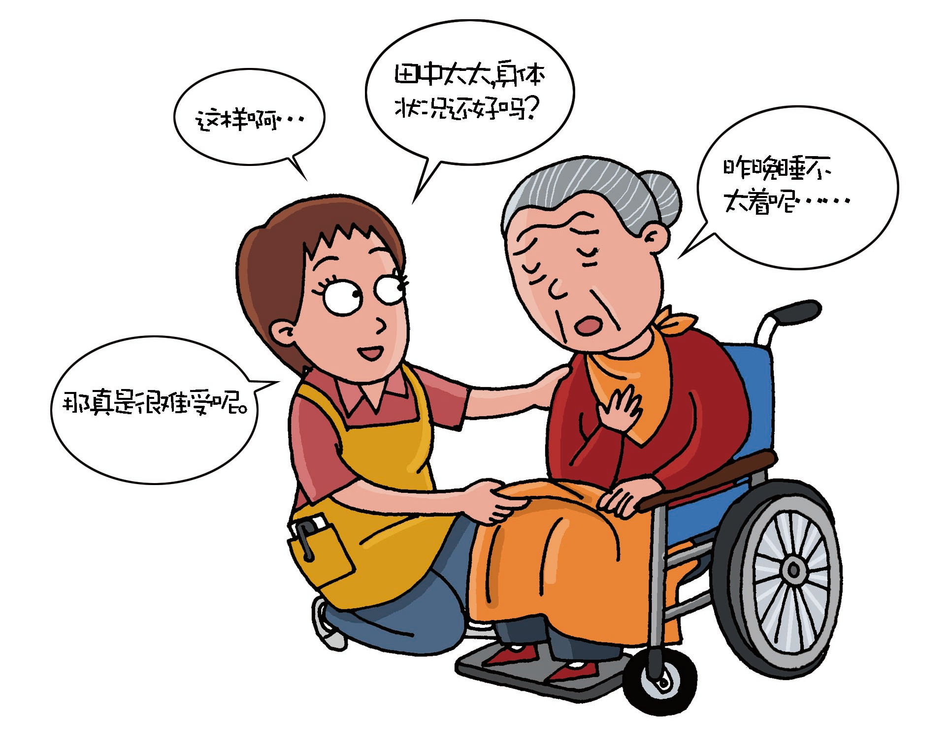 尊重對方并使用敬語:需要護理的多是老年患者,在與他們接觸時,要懷著尊重、敬重的情感,不要忘記使用敬語。