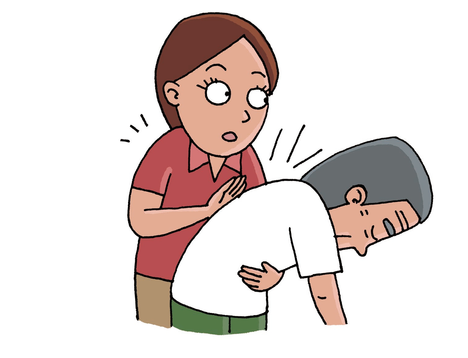、谧尰颊呱眢w向前彎下,用手掌根在肩胛骨之間猛擊幾次。