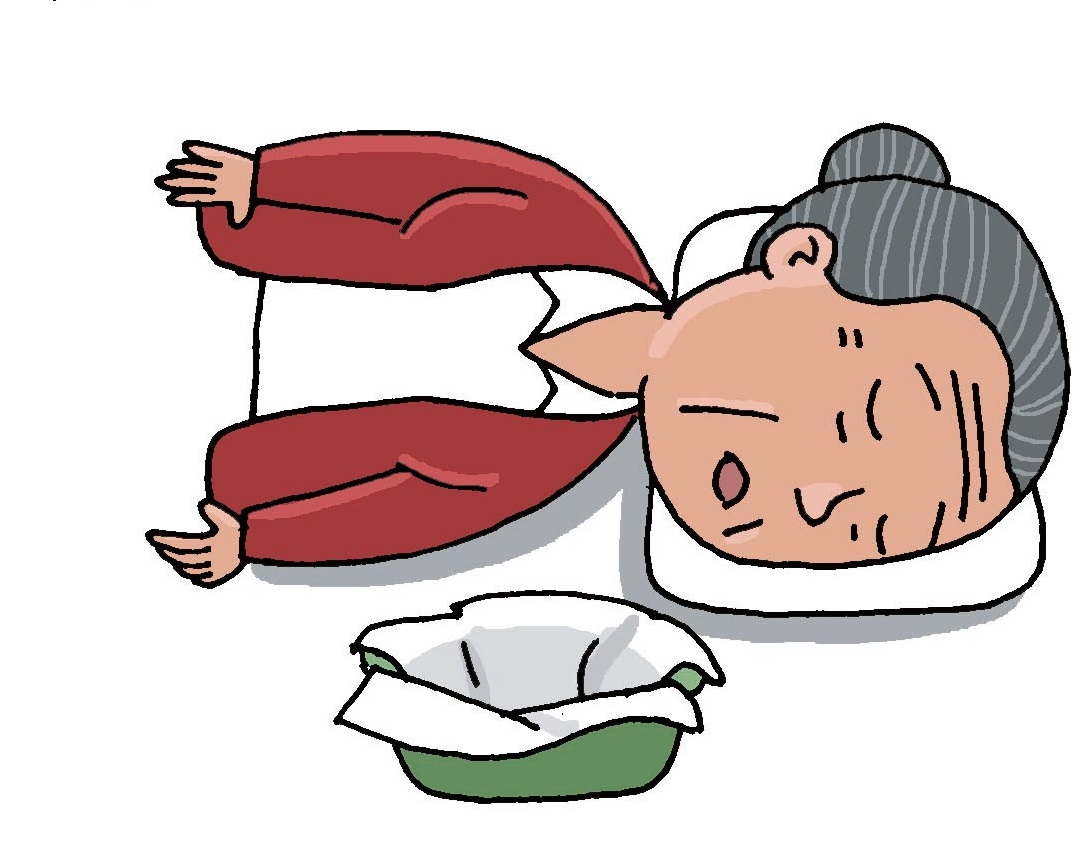 、谒砷_(kāi)患者衣服,躺下,臉部側(cè)向一邊(準(zhǔn)備好臉盆)。在無(wú)法控制住嘔吐的情況下,為防止窒息要將全身橫躺。