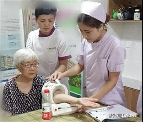 ▲普親養(yǎng)老與醫(yī)院開展合作,用醫(yī)院的專用設(shè)備為老人做身體檢查。