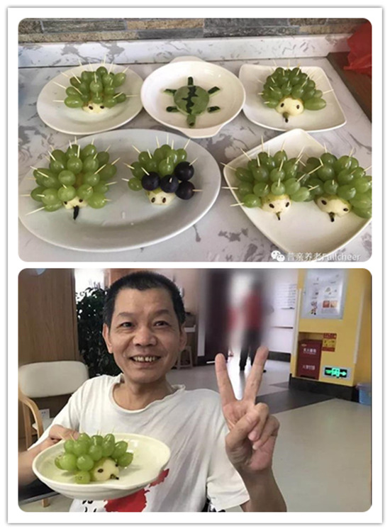 ▲爺爺奶奶親手做的水果拼盤,看到刺猬和烏龜,大普不得不佩服大家的創(chuàng)造力
