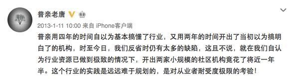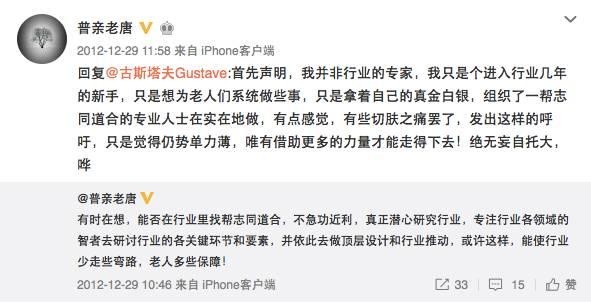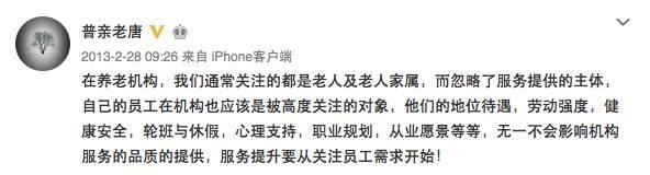 2012年,養(yǎng)老行業(yè)開(kāi)始在國(guó)內(nèi)紅火起來(lái),各種政策的出臺(tái),外資的不斷涌現(xiàn)等。熱火朝天的新浪微博上突然出現(xiàn)許多貼著養(yǎng)老標(biāo)簽的“專(zhuān)家”。有一位昵稱(chēng)為“普親老唐”的人出現(xiàn)的頻率很高,經(jīng)常能夠看到其對(duì)養(yǎng)老的各種點(diǎn)評(píng)與感慨。