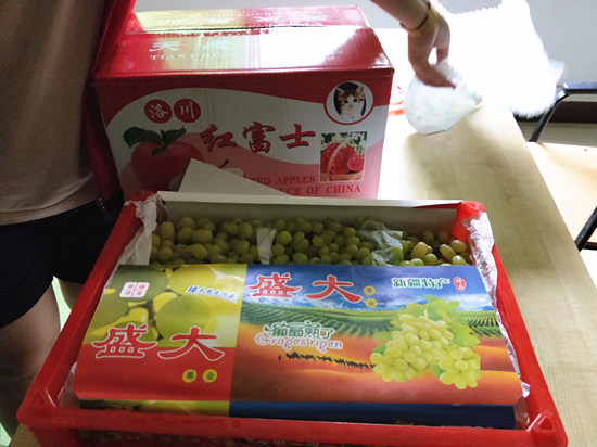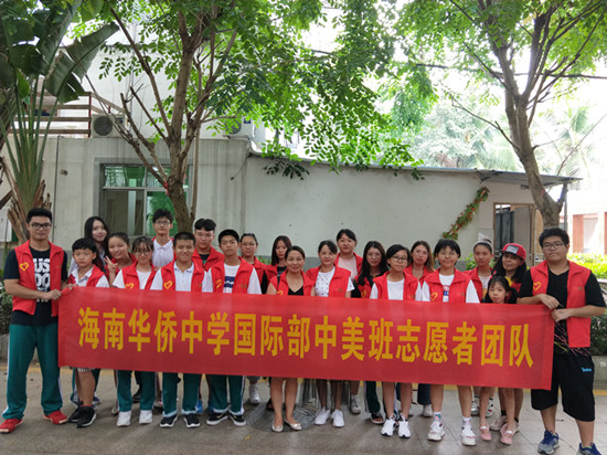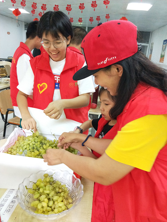 海南僑中的志愿者們過來看望老人,給老人們帶了慰問水果,還陪老人們畫畫。