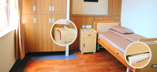 臥室家具均采用無尖角處理,在使用尺寸上充分考慮老年人生理特點(diǎn),同時(shí)考慮配合輪椅的適用性。家具配色溫和,面料舒適。