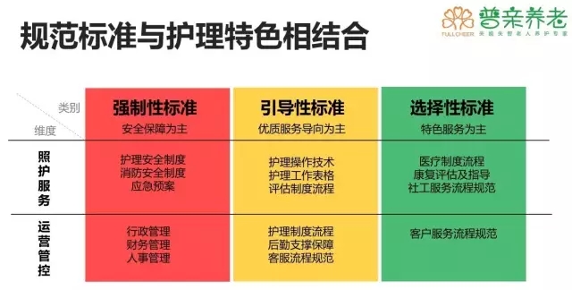 所謂制定標準的核心歸納起來就三個字,即:管、服、放! 管就是管住安全,包括機構(gòu)安全和護理安全。服,就是服務(wù),設(shè)計標準時一定要關(guān)注流程的順暢,一線員工服務(wù)好老人,支持部門的員工服務(wù)好一線員工,流程設(shè)計時要從員工實操角度來思考是否便于操作與執(zhí)行。放,就是要讓員工用放松的心態(tài)去從事服務(wù)活動;另外要用開放的心態(tài)去整合標準。我們現(xiàn)在也有引入從日本歸國的專家團隊----介護之慧,在普親體系內(nèi)獨立的進行認知癥照護的理論研究與實踐。我們也有參與山西省養(yǎng)老機構(gòu)的服務(wù)質(zhì)量的綜合評估,幫助他們制定養(yǎng)老機構(gòu)服務(wù)質(zhì)量評價標準。