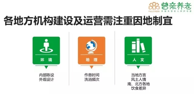 作為全國連鎖運營商,普親的機構(gòu)布點遍布全國各個地區(qū)。在籌建機構(gòu)時,一定會參與前期的設(shè)計,我們不要做錦江之星那種無差別的連鎖化機構(gòu),會特別針對地理區(qū)位、日照的時間、通風(fēng)采光環(huán)境等養(yǎng)老關(guān)鍵因素,以及住家風(fēng)格做不同的產(chǎn)品規(guī)劃設(shè)計;同時在運營過程中也要根據(jù)南北差異、風(fēng)土人情等因素,做到因地制宜,這樣做出來的養(yǎng)老院,老人住在里面才會有家的感覺,才會放松。