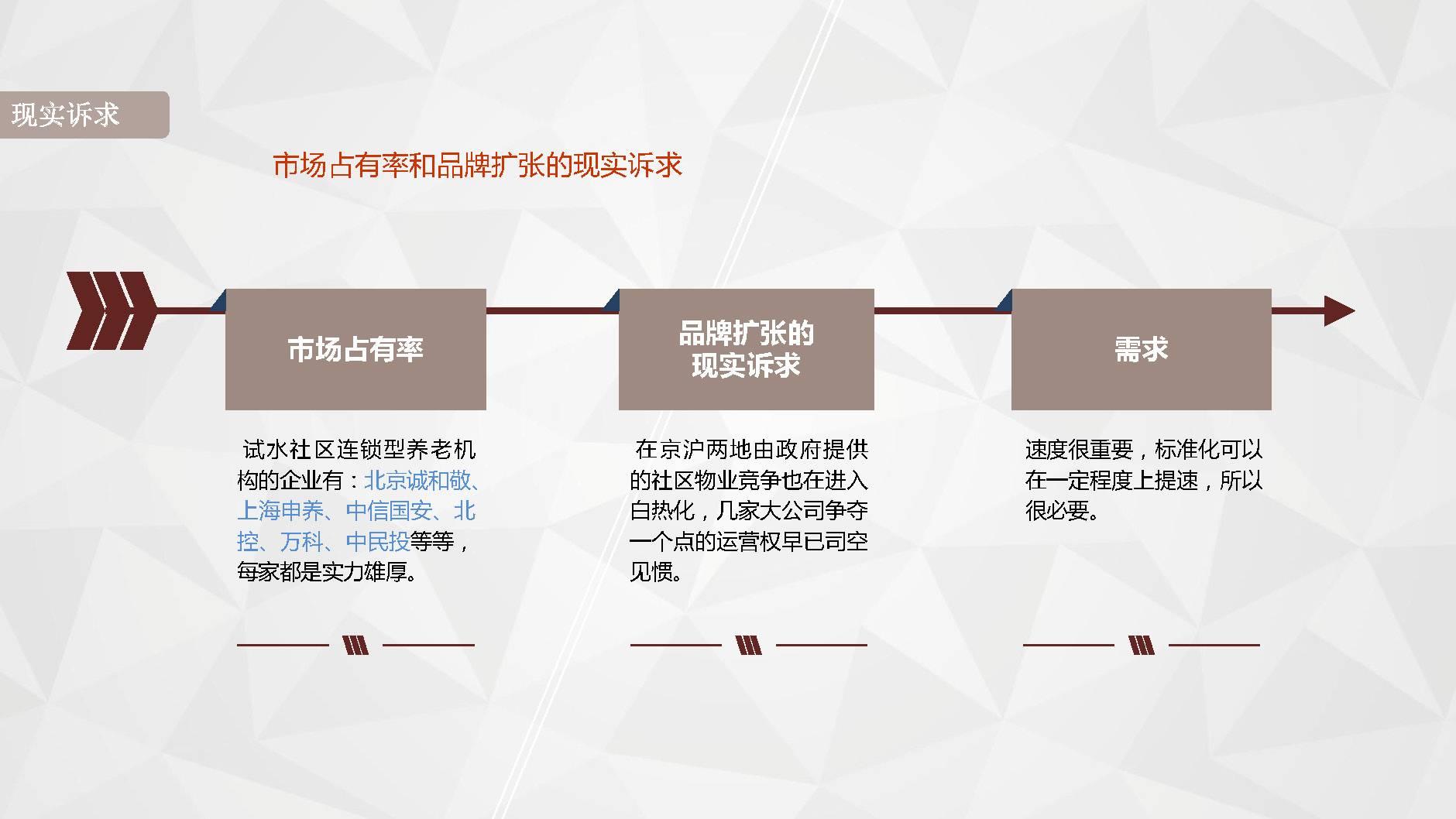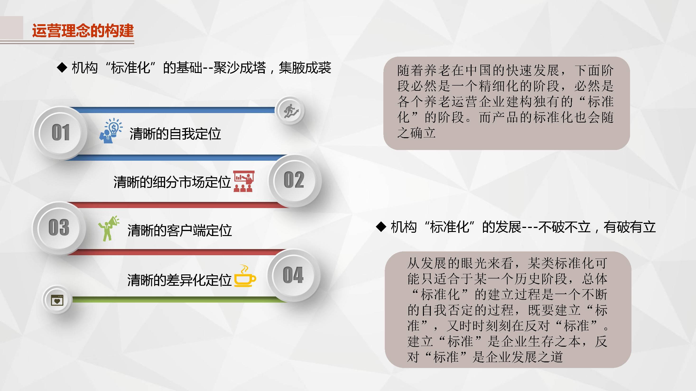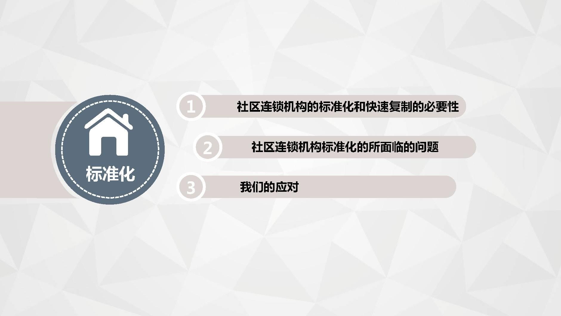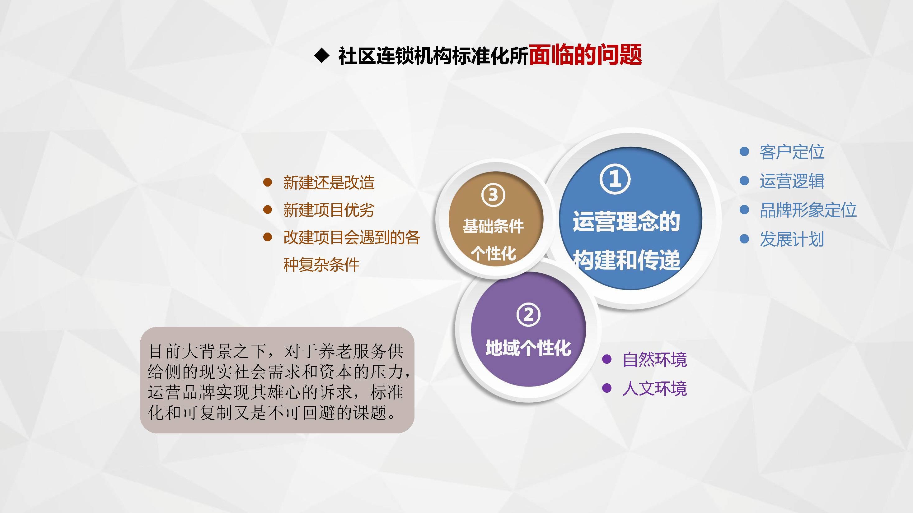 上面這些是現(xiàn)實,我想主要的原因是社區(qū)連鎖機構(gòu)及其衍生品這種業(yè)態(tài)符合中國國情和中國養(yǎng)老產(chǎn)業(yè)發(fā)展的現(xiàn)狀,想要在攻城略地,跑馬圈山的競爭中占先,速度很重要,而標準化就是提速的有效方法之一。