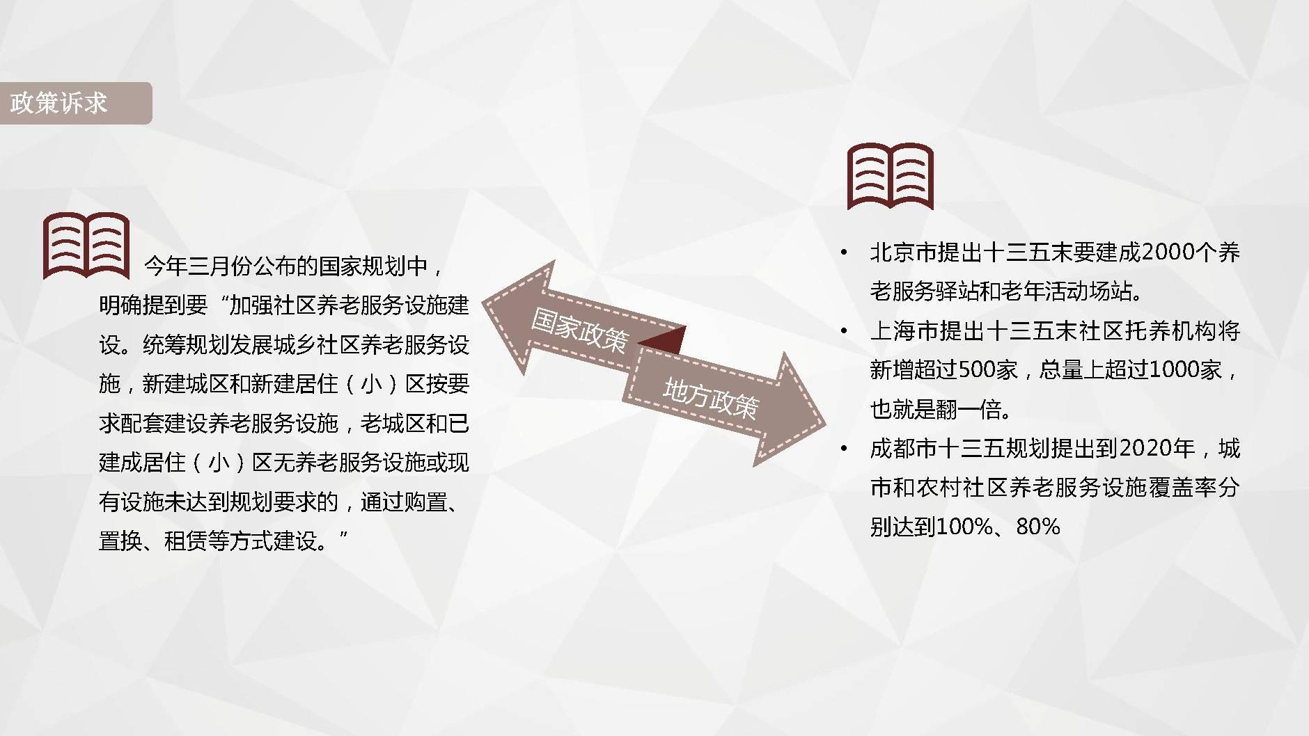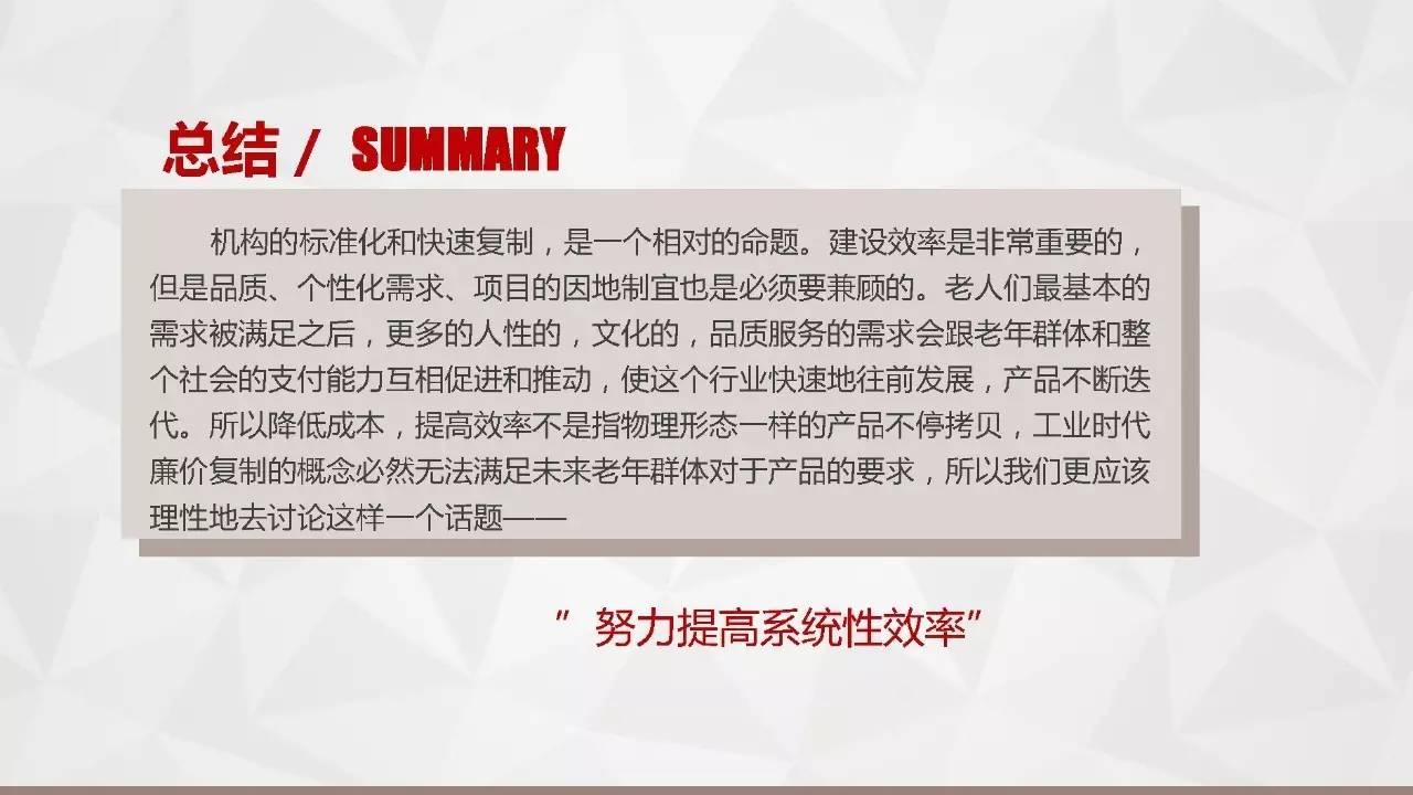 機構(gòu)的標準化和快速復制,是一個相對的命題。建設(shè)效率是非常重要的,但是品質(zhì)、個性化需求、項目的因地制宜也是必須要兼顧的。老人們最基本的需求被滿足之后,更多的人性的,文化的,品質(zhì)服務(wù)的需求會跟老年群體和整個社會的支付能力互相促進和推動,使這個行業(yè)快速地往前發(fā)展,產(chǎn)品不斷迭代。