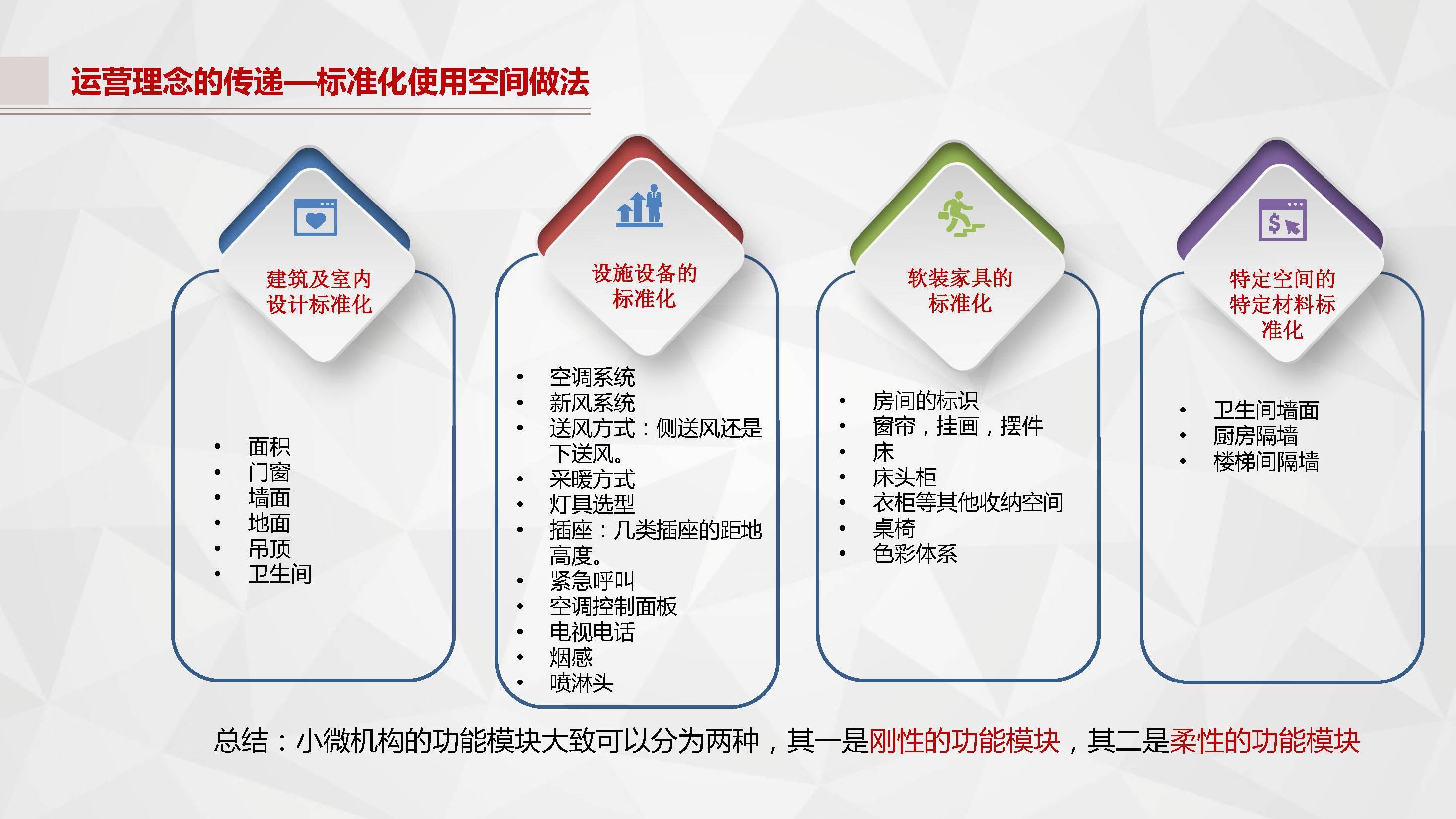 網(wǎng)絡(luò)上的照片“XX院滾出社區(qū)”,都是很殘酷的現(xiàn)實。還有建筑物建成年代,結(jié)構(gòu)形式,機電設(shè)備現(xiàn)狀,尤其需要提醒的是現(xiàn)狀消防設(shè)施能不能改,好不好改,消防不通過,其它都談不上。個性化的問題越多,標準化和可復制的實現(xiàn)程度就會受到越多的影響和掣肘。但是在目前大背景之下,對于養(yǎng)老服務(wù)供給的現(xiàn)實社會需求,資本的壓力,運營品牌的雄心,標準化和可復制又是必須面對的課題。