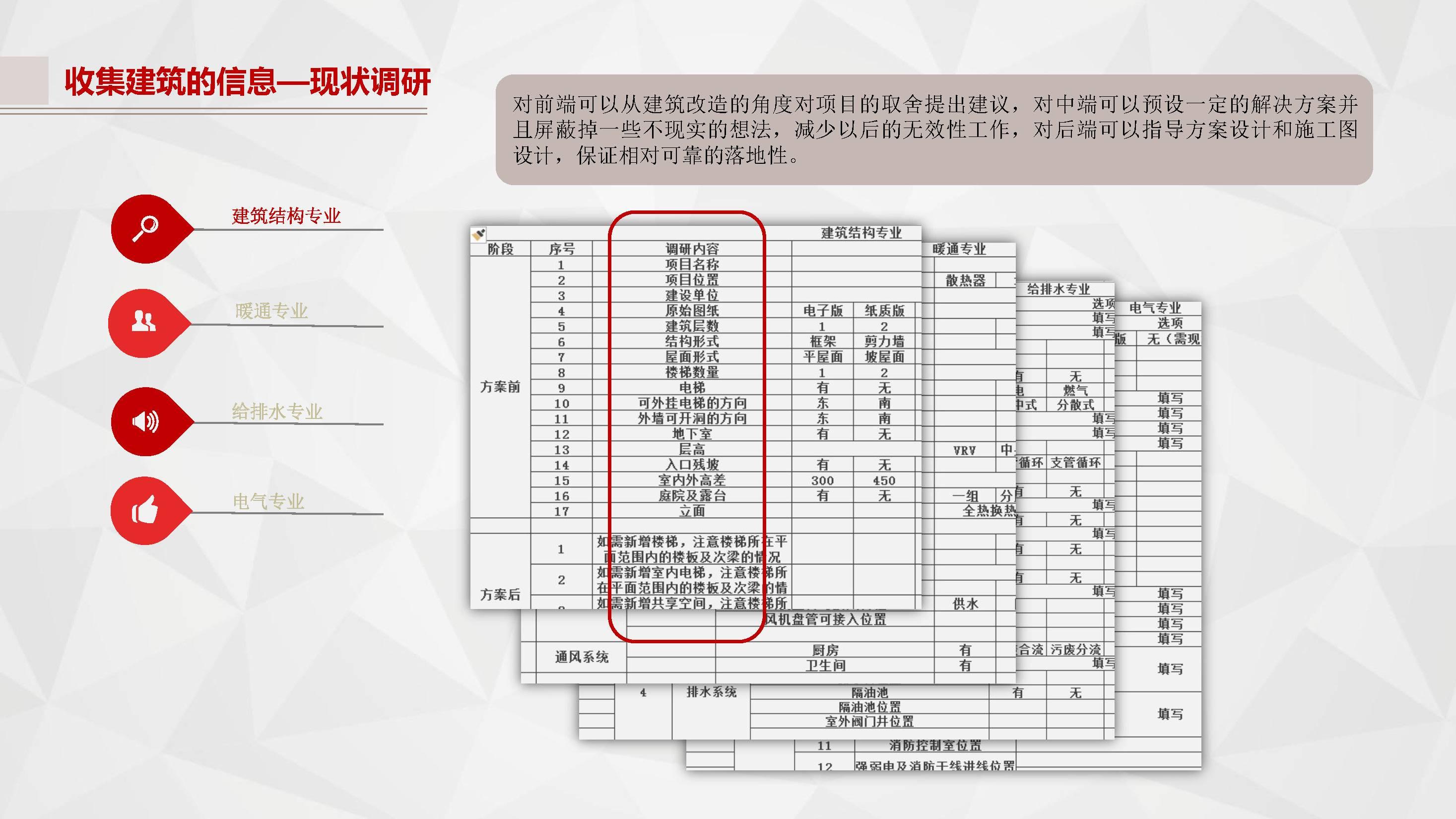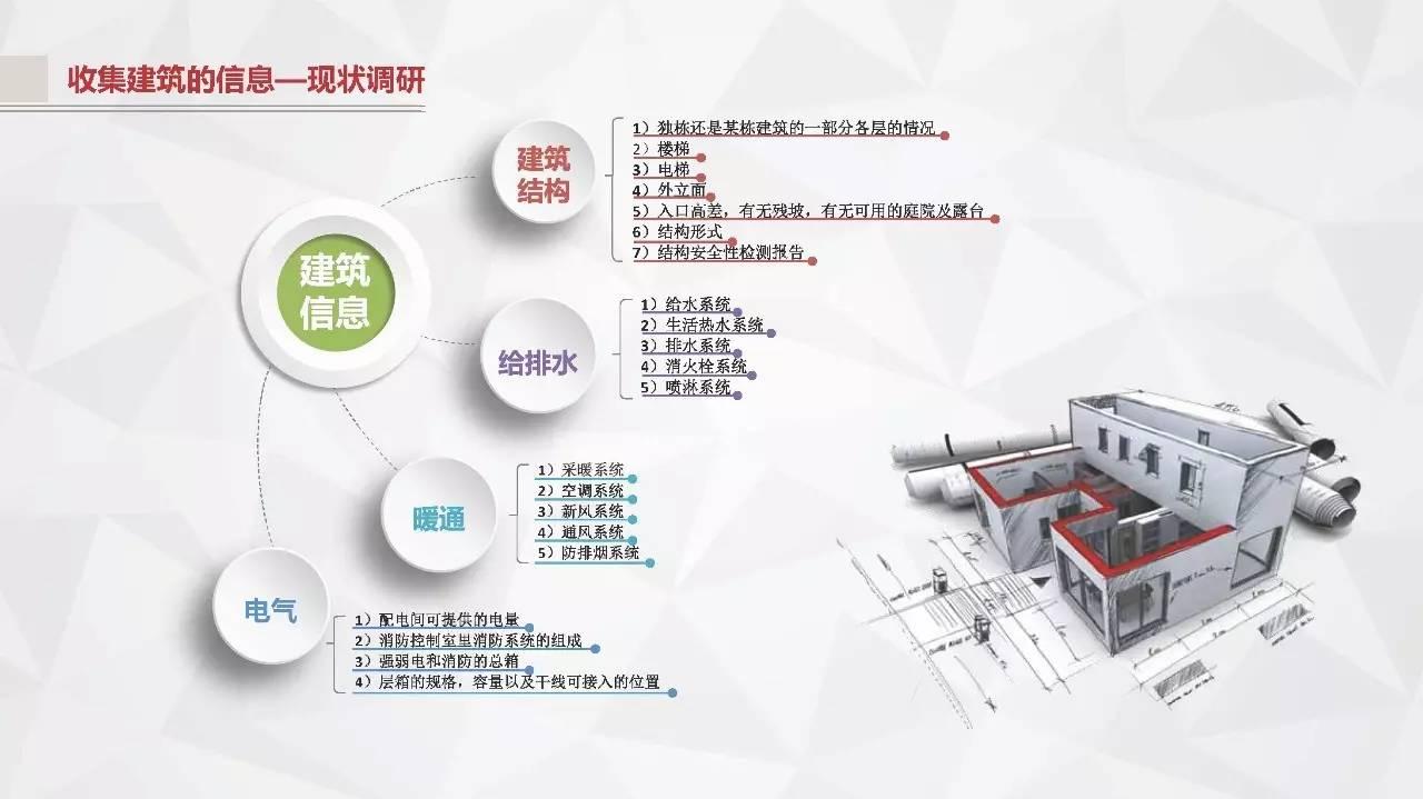現(xiàn)場調(diào)研,建筑本身的信息收集和分析的過程,需要設(shè)計方和業(yè)主一起完成,解決的是能不能做的問題。當然最好有各專業(yè)齊備的原始圖紙,通�?梢詮臉I(yè)主,物業(yè),建設(shè)方,設(shè)計院,檔案館等渠道獲得。事實上很難齊備,而且建筑物使用的現(xiàn)狀和原始圖紙也不一定對的上。