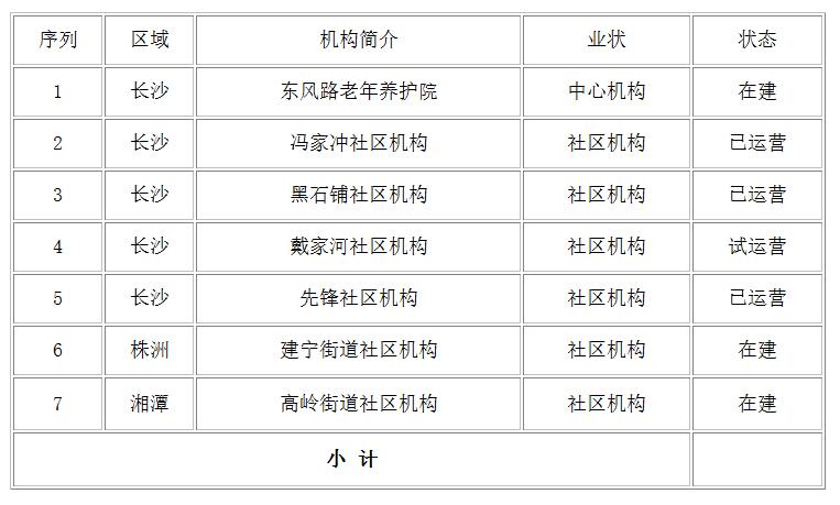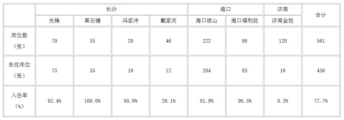 在建機構(gòu)7家(長沙1家,株洲1家,湘潭1家,太原1家,福建長汀1家,浙江臺州1家,北京1家),合計床位數(shù)859張。儲備養(yǎng)老機構(gòu)項目30多個,包含華東區(qū)6個,華南區(qū)13個,華西區(qū)6個,華北區(qū)6個,其中30%為公建民營項目,合計床位數(shù)超過2000張。