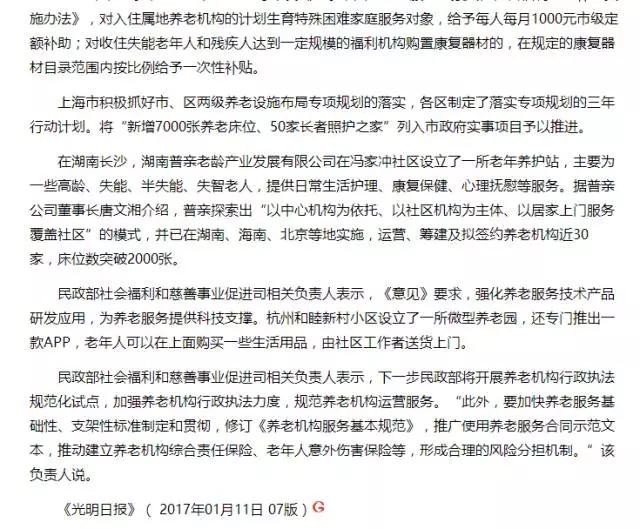 《關于全面放開養(yǎng)老服務市場提升養(yǎng)老服務質量的若干意見》(以下簡稱《意見》)日前公布,民政部社會福利和慈善事業(yè)促進司相關負責人表示,這是全面放開養(yǎng)老服務市場,及早、科學、綜合應對人口老齡化的具體行動�!跋乱徊�,民政部還將研究制定老年人狀況統(tǒng)計調查和公布制度、養(yǎng)老機構分類管理制度、老年人能力和需求評估與入住評估制度、相關保險和福利及救助相銜接長期照護保障制度,推動修訂和完善《養(yǎng)老機構設立許可辦法》和《養(yǎng)老機構管理辦法》,建立養(yǎng)老服務綜合治理機制。”