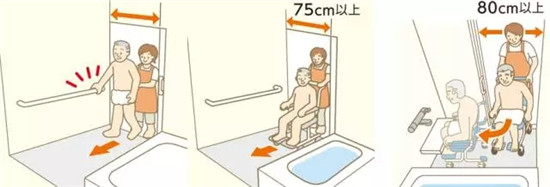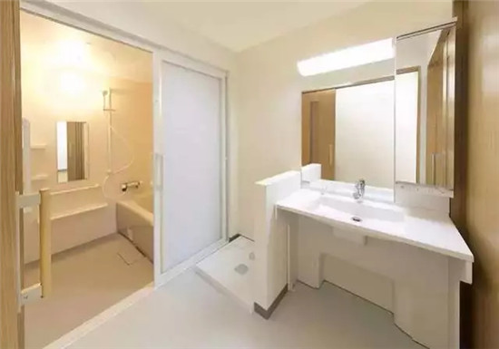 直接進(jìn)入浴室時(shí),需75cm以上;當(dāng)進(jìn)入需迂回時(shí),門開尺寸至少80cm以上(洗浴過道容身處亦大于80cm);進(jìn)入浴室路上應(yīng)沒有障礙。