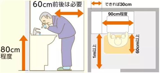 老人站立時(shí),80cm是化妝柜的舒適高度,可以減少腰部的負(fù)擔(dān),以及水不容易流向肘部而滴落,深度空間上需要達(dá)到60cm,這樣的空間站或者坐都恰好了。