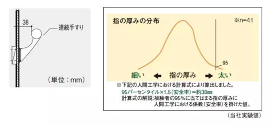 根據(jù)實(shí)驗(yàn)者95%手指的厚度分布數(shù)據(jù):扶手和墻壁的間距=手指直徑*1.5(安全率)≈38mm。