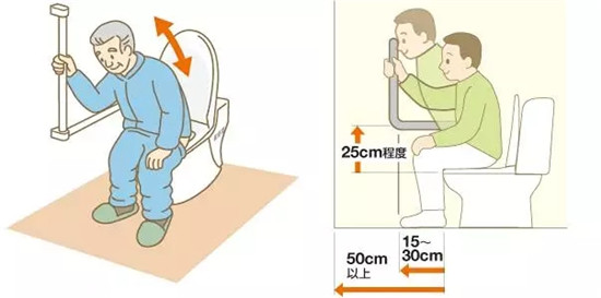 大家都知道起身的時(shí)候:手撐著的力氣需要支撐整個(gè)身體,而由順手處的扶手拉的過程則省力許多(可以自己做個(gè)試驗(yàn)),所以扶手的位置應(yīng)設(shè)定在離馬桶15~30mm的墻壁上。
