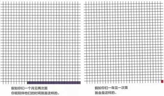 對(duì)于父母:假如你們一個(gè)月見兩次面,你能陪他們的時(shí)間就20格,假如你們一年就見一次面,你能陪他們的時(shí)間就那么短短1格。