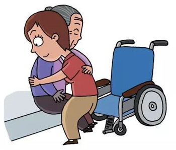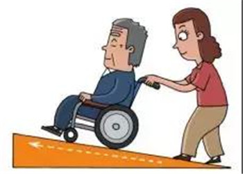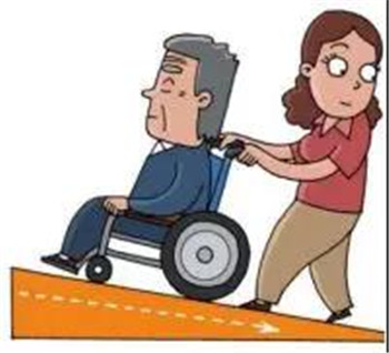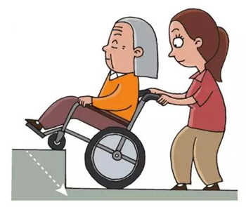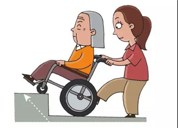 1)上坡:讓老人上半身前傾,將輪椅勻速向上推著前進。