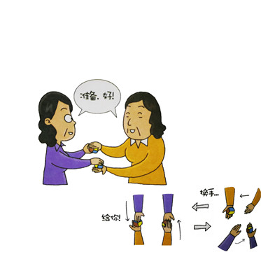 注意是右手傳左手接。