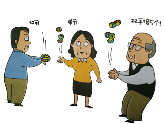 努力做到在拋接2個(gè)沙包時(shí),動(dòng)作有序,不要亂。