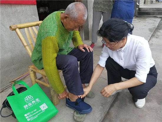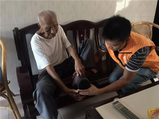 李爺爺已經(jīng)100歲了,依然精神矍鑠,穿上幫扶小組贈(zèng)送的新鞋非常高興。