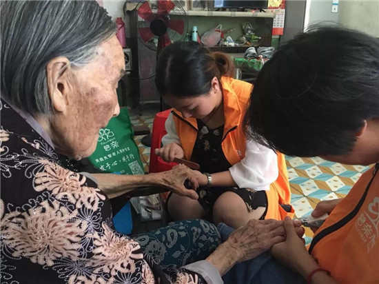 老年能力評(píng)估開展完后,幫扶小組為奶奶量血壓、剪指甲。