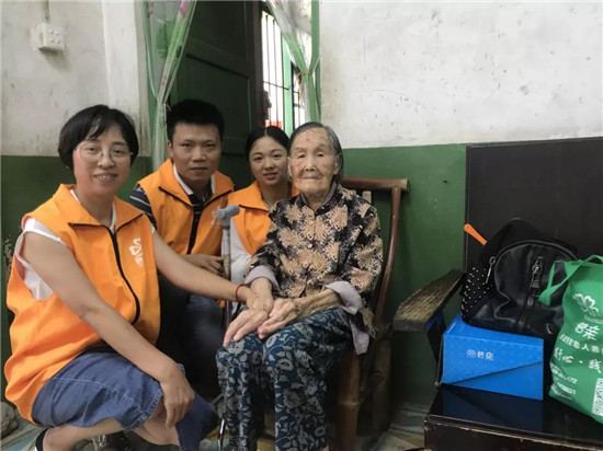 103歲的陳奶奶看見幫扶小組來了還特意換上了新衣服,開心的和幫扶小組的成員聊天。