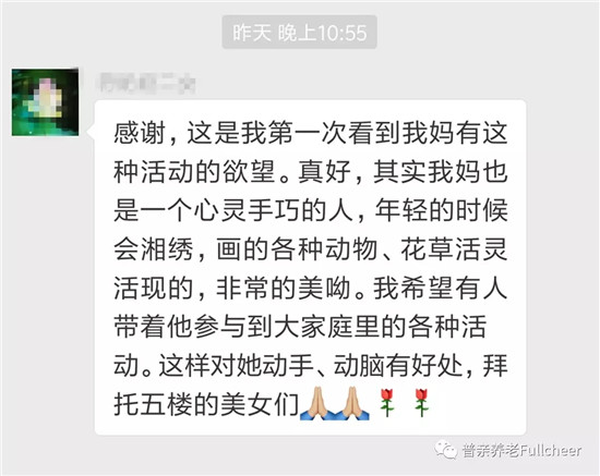 長(zhǎng)沙市普親先鋒社區(qū)老年養(yǎng)護(hù)中心的符奶奶家屬在家屬群里看到志愿者和奶奶一起折紙之后,有感而發(fā):