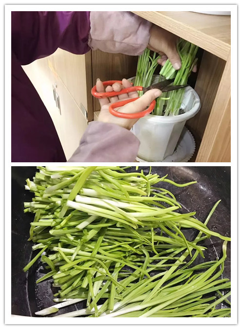 在室內(nèi)空調(diào)房里,大蒜長勢喜人,三五天就有了明顯的變化。一盆盆大蒜紛紛抽出新芽,蒜苗越長越高,老人臉上的笑容都多了。長好的蒜苗被廚師用來做了一道蒜苗炒雞蛋,黃綠搭配,賞心悅目!