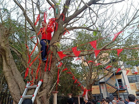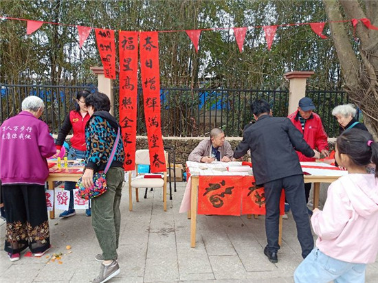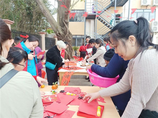 而最具年味的傳統(tǒng)藝術(shù)區(qū)更是深受大家的歡迎,“送福到家之寫春聯(lián)”攤位聚集了多位書法家和許多書法愛(ài)好者,大家盡情揮灑,一幅幅紅紅火火的“�!彼偷搅舜蠹业氖种�,一對(duì)對(duì)年味十足的春聯(lián)高高掛起,非常漂亮。大家排著隊(duì),將福氣帶回家�!盎ㄩ_(kāi)富貴之剪窗花”的攤位上大家都全神貫注于自己的創(chuàng)作,一張張紅紙?jiān)诖蠹业那墒种伦兂珊每吹拇盎�,有的爺爺奶奶剪了送給子女,也有的子女剪了父母的生肖送給父母,溫馨熱鬧的氛圍下洋溢著滿滿的感動(dòng)。而“心想事成之許愿祈福”攤位在院內(nèi)大的一棵大樹(shù)邊上,大家在滿滿祝福的紅絲帶上寫上自己的心愿,掛到大樹(shù)上,送出美好的祝福。
