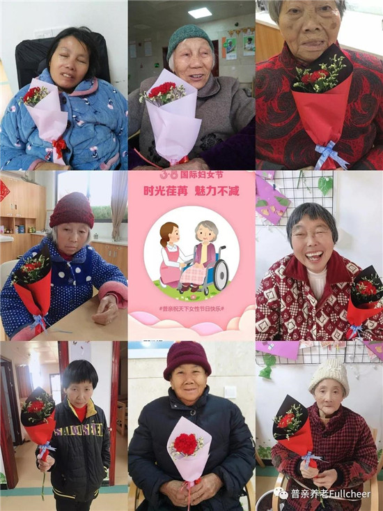 平常埋頭在工作里,穿著素色的上班裝,除了老人的笑臉,生活里再少有靚麗風(fēng)景。趁著這次的三八婦女節(jié),養(yǎng)護(hù)院為每一位女性長者和女性職工都準(zhǔn)備了一束象征愛、魅力與尊敬的康乃馨。收到花的她們,光暈悄悄浮上臉龐,留下合影后,便悄然投身進(jìn)了一天忙碌的工作。