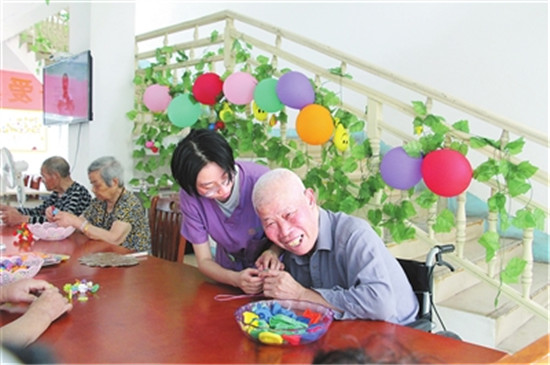 福利院工作人員正在帶領(lǐng)失能老人進(jìn)行康復(fù)鍛煉。通訊員 胡剛葵攝
