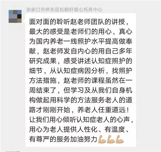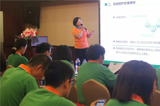 在非藥物干預的章節(jié)里,趙老師為我們這樣舉例:認知癥老人就像一部16G的手機,手機并沒有壞,只是內存儲備不再夠用,即老人的感受并沒有喪失,只是無法再將感受存儲進大腦。在照護中,我們要充分尊重老人,明確護理是一個行為;而作為管理者,一定不能忽視非藥物療法在長期照護中的作用,要讓整個團隊都有此方面的意識。