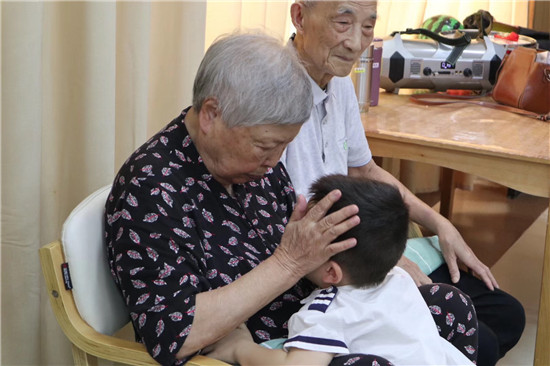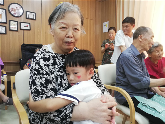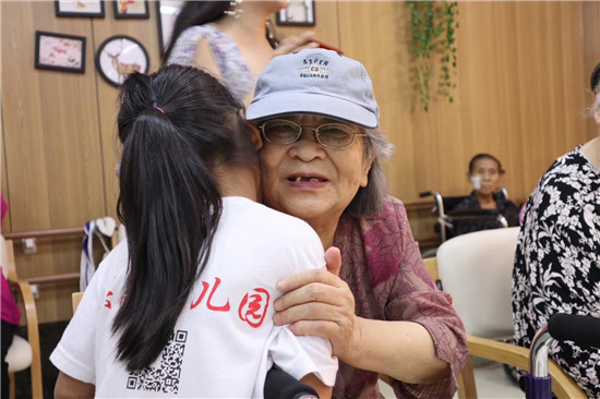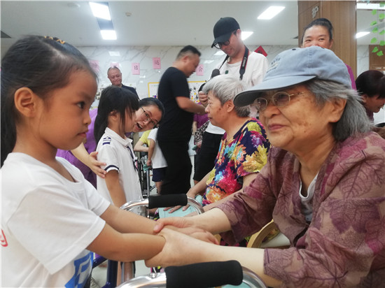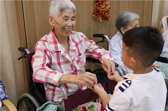小朋友們活潑可愛,頓時點(diǎn)燃了長者們的熱情。在長者與小志愿者互相認(rèn)識后,小志愿者們表演了音樂律動《你笑起來很好看》、歌謠《打月餅》,活動場面洋溢著歡聲笑語,一片喜氣洋洋。接下來的游戲《泡泡糖》,更是將氣氛帶到了高潮。“泡泡糖,真荒唐,一不小心黏到小臉龐……�!毙≈驹刚邆兣c長者們臉貼著臉,額頭頂著額頭、大手牽著小手,是零距離的接觸,更是溫情的感動。