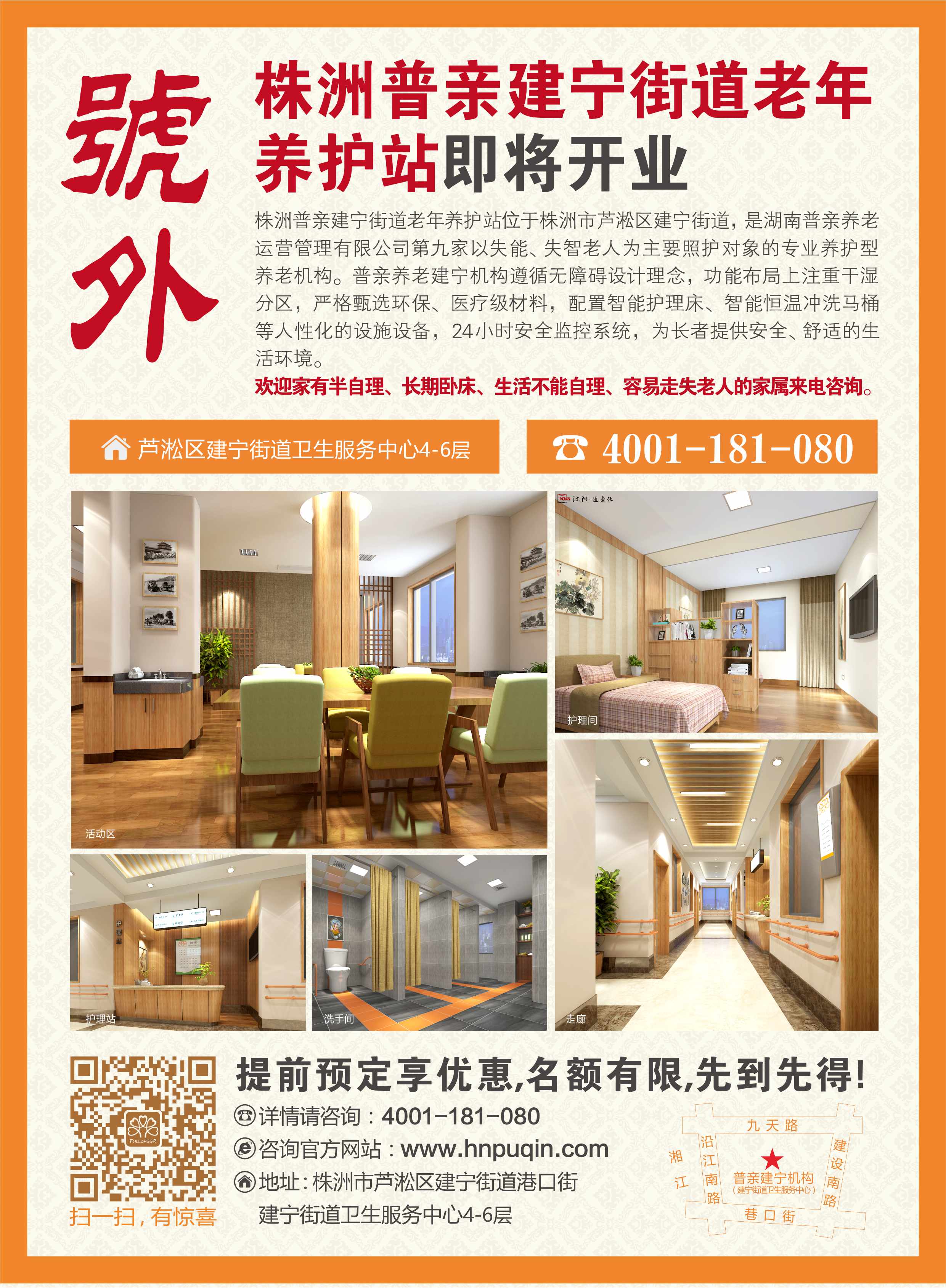 株洲普親建寧街道老年養(yǎng)護(hù)站位于株洲市蘆淞區(qū)建寧街道,是湖南普親養(yǎng)老運(yùn)營管理有限公司第九家以失能、失智老人為主要照護(hù)對象的專業(yè)養(yǎng)護(hù)型養(yǎng)老機(jī)構(gòu)。 機(jī)構(gòu)始終堅(jiān)持“普愛桑榆·親如家人”的服務(wù)理念,遵循適老化無障礙設(shè)計(jì),功能布局上注重干濕分區(qū),嚴(yán)格甄選環(huán)保、醫(yī)療級材料,配置智能護(hù)理床、智能恒溫沖洗馬桶等人性化的設(shè)施設(shè)備,24小時(shí)360度安全監(jiān)控,為長者提供安全、舒適的生活環(huán)境。