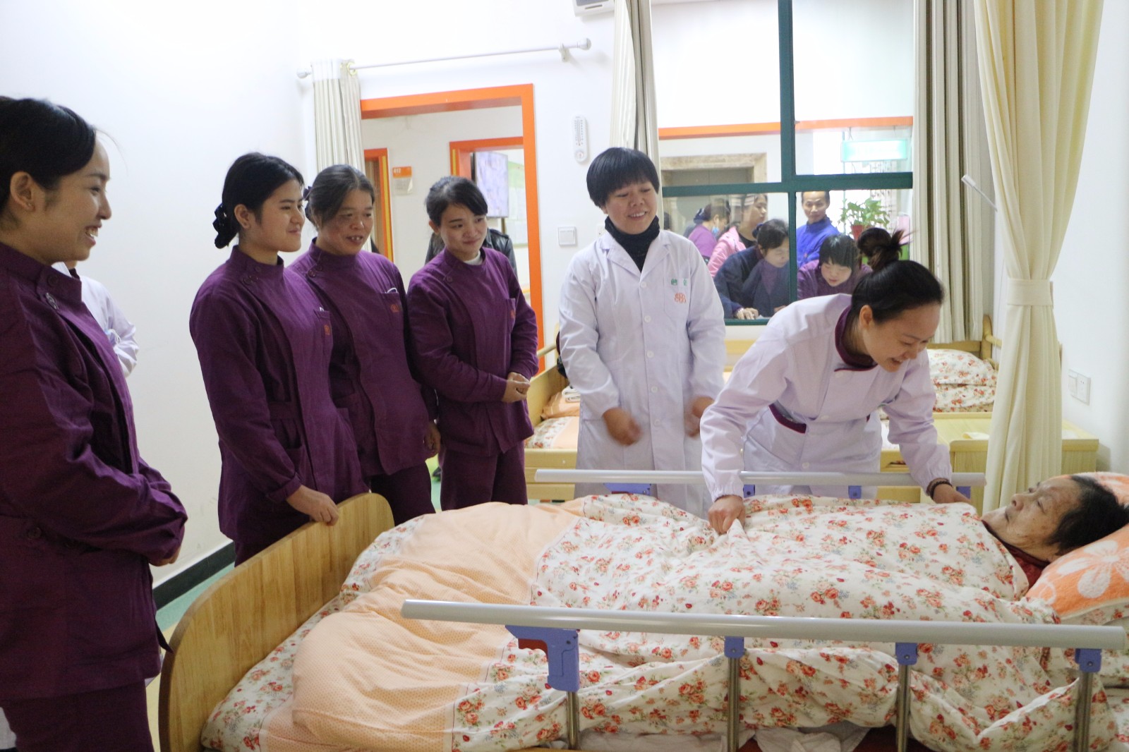 護(hù)理服務(wù)的標(biāo)準(zhǔn)化能夠更加保證優(yōu)質(zhì)服務(wù)的實踐,小伙伴們圍繞在長者的床前認(rèn)真學(xué)習(xí)標(biāo)準(zhǔn)化服務(wù)。