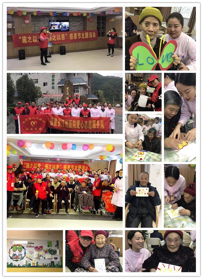 26日上午,咱們位于大美汀州的長(zhǎng)汀普親老年養(yǎng)護(hù)院也舉辦了感恩節(jié)主題活動(dòng),長(zhǎng)汀縣義工協(xié)會(huì)大同分會(huì)和福建省汀州醫(yī)院的護(hù)士們也一起參與了活動(dòng),陪著老人聊天,與老人們一起制作感恩賀卡,合唱感恩之歌,雖然只有短短的一個(gè)上午,大家卻還是一起度過(guò)了一段美妙的時(shí)光。