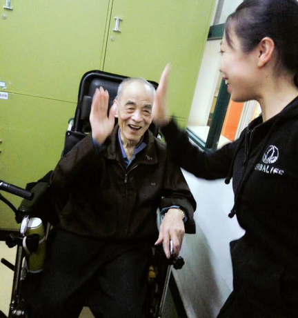 失能老人開心地與養(yǎng)護(hù)站工作人員擊掌