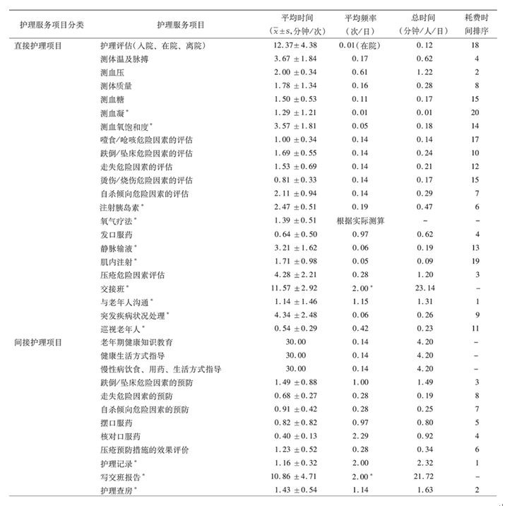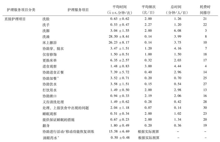 護(hù)士所提供護(hù)理服務(wù)流程參照《基礎(chǔ)護(hù)理服務(wù)工作規(guī)范》和《常用臨床護(hù)理技術(shù)服務(wù)規(guī)范》,再對(duì)各直接護(hù)理項(xiàng)目進(jìn)行多次測(cè)量取其平均值。測(cè)量采用專用計(jì)時(shí)秒表。
