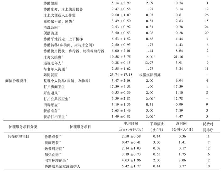 養(yǎng)老機(jī)構(gòu)輔助生活區(qū)護(hù)理人員,每日為每位老年人所提供護(hù)理服務(wù)的平均時(shí)間、平均頻次、總時(shí)間( 總時(shí)間 = 平均時(shí)間 × 平均頻次 )以及所用時(shí)間排序,詳見(jiàn)表1和表2。養(yǎng)老機(jī)構(gòu)輔助生活區(qū)護(hù)理員與護(hù)士共同完成服務(wù)均為間接護(hù)理項(xiàng)目,每項(xiàng)的平均時(shí)間及平均頻次詳見(jiàn)表3。