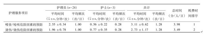 表1、養(yǎng)老機(jī)構(gòu)輔助生活區(qū)護(hù)理員提供服務(wù)平均時(shí)間及平均頻次( n = 28 )