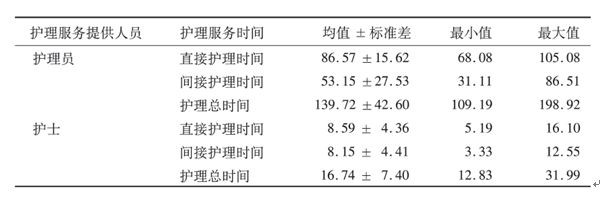 在護(hù)理員提供的護(hù)理服務(wù)中,直接護(hù)理時(shí)間明顯多于間接護(hù)理時(shí)間( t = 13.577,P = 0.002 ),在護(hù)士提供的護(hù)理服務(wù)中,直、間接護(hù)理時(shí)間無(wú)統(tǒng)計(jì)學(xué)差異( P > 0.05 )。