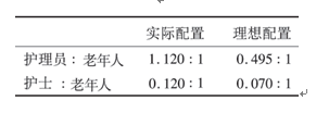 通過(guò)工時(shí)測(cè)定法計(jì)算所得護(hù)理員日均直接護(hù)理時(shí)間,多于日均間接護(hù)理時(shí)間,護(hù)士直接護(hù)理時(shí)間和間接護(hù)理時(shí)間無(wú)統(tǒng)計(jì)學(xué)差異;養(yǎng)老機(jī)構(gòu)輔助生活區(qū)養(yǎng)老護(hù)理員、護(hù)士與老年人的實(shí)際配比,分別為 1.120∶1 和 0.120∶1 ,理想配比分別為 0.495∶1 和 0.070∶1 。