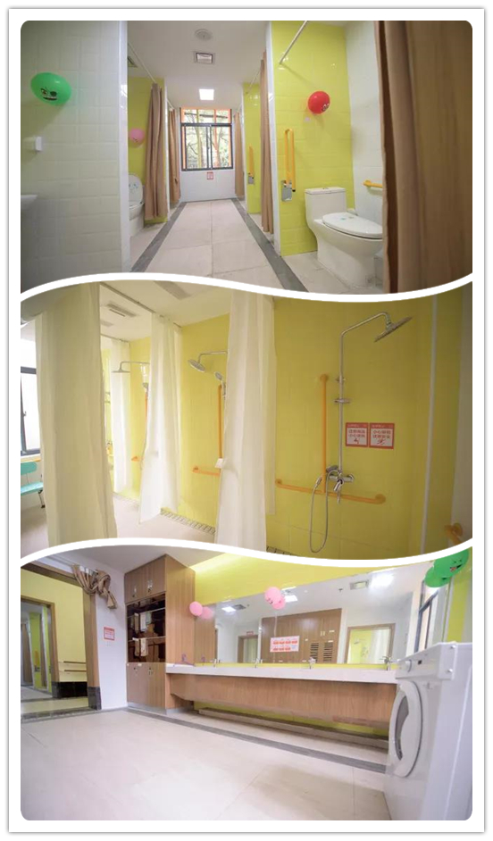 大空間能夠有效減少長者在如廁、沐浴時的壓迫緊張感,再加上機構(gòu)將墻面整體設(shè)計成鵝黃的暖色調(diào),可以帶給老人良好的視覺感受。