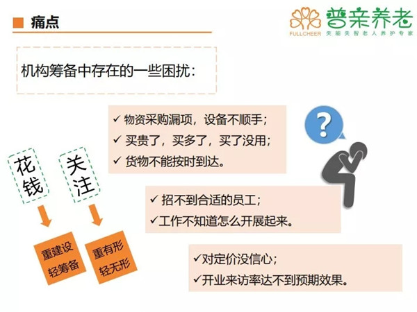 舉個(gè)例子,比如剛才說(shuō)了采買會(huì)漏東西。在專業(yè)培訓(xùn)的時(shí)候說(shuō)一個(gè)星期陪老人稱一次體重,但物資采購(gòu)的時(shí)候卻沒(méi)有買體重秤。這反映的實(shí)際上就是專業(yè)培訓(xùn)流程沒(méi)有真正的落實(shí),從而不能形成一個(gè)體系化的系統(tǒng)。