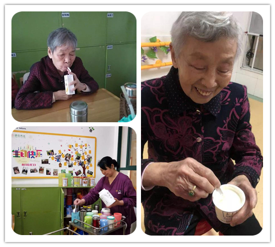 護(hù)理員正在為爺爺奶奶們沖泡牛奶
