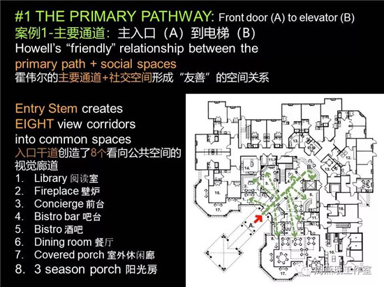在過去的30年中,美國、歐洲的養(yǎng)老設(shè)施建筑的研究慢慢發(fā)現(xiàn),主要通道(從入口到主電梯的這一段)的空間設(shè)計(jì)十分重要,如果能夠做得比較友善,會(huì)利于人們對(duì)建筑形成友善的印象。