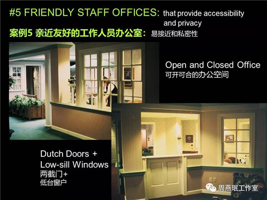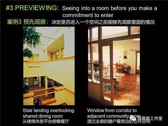 考慮到人們對(duì)社會(huì)關(guān)系的本能認(rèn)知,進(jìn)入房間之前,如果能夠看到里面的情況,對(duì)于人的心理感受會(huì)有很好的提升。這兩個(gè)案例都是通過窗戶或者是降低扶手的高度的方式,起到在相互交往或者決定交往之前能夠提前預(yù)判的作用。