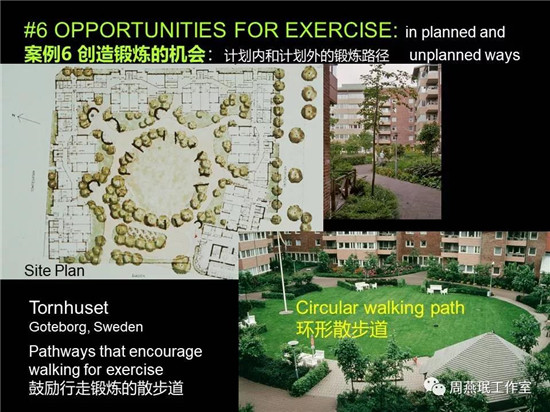 剛才提到那本《成功老齡學(xué)》的書,說到鍛煉對(duì)老人提高壽命、生命質(zhì)量非常重要,如果那本書現(xiàn)在才出版的話,肯定會(huì)更加強(qiáng)調(diào)鍛煉的重要性。在養(yǎng)老設(shè)施的設(shè)計(jì)之中,例如圖中的居住組團(tuán),設(shè)計(jì)中注意保證每個(gè)單元一出門便能夠在庭院繞圈,對(duì)于老人來說是非常容易做到的,也非常直觀的鍛煉方式,在建筑上也比較容易實(shí)現(xiàn)�?傊�,一定要為老人提供就近鍛煉、安全鍛煉的場(chǎng)所。
