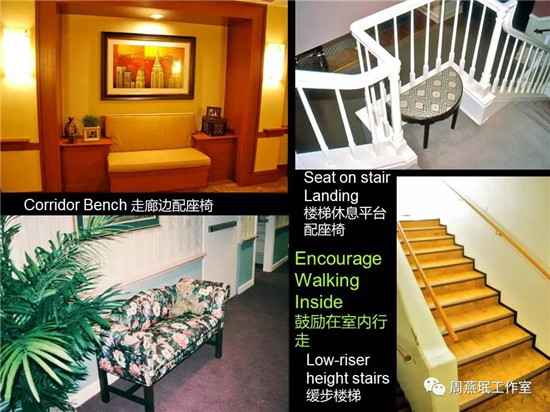 鍛煉不光在室外,在室內(nèi)一定要繼續(xù),走廊、樓梯都存在老人鍛煉的機(jī)會(huì)。除了座椅是必須設(shè)置的,臺(tái)階的高度也一定要控制好,另外踏步之間布置休息平臺(tái)也十分必要�?傊�鍛煉的理念要從室內(nèi)到室外,貫始至終。